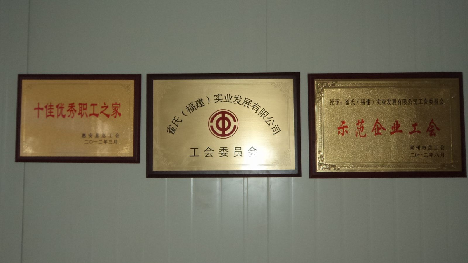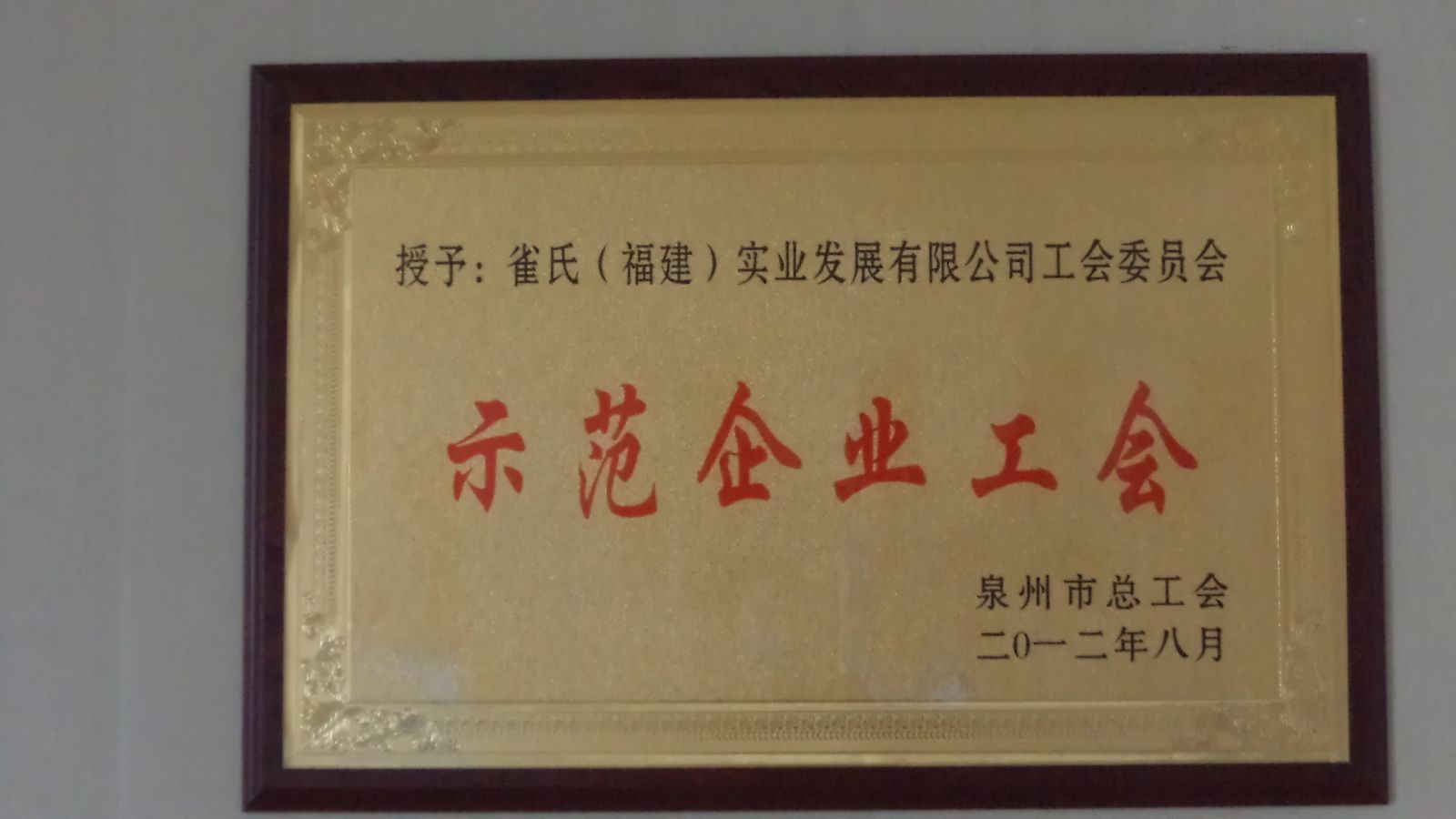 2012年8月线上足球官网工会荣获泉州市总工会颁发的“泉州市示范企业工会”。全市仅50家非公有制企业工会获此殊荣,市总工会对于我们的工作肯定,我们一定再接再厉,创造更好的成绩,在职工和企业之间搭建良好的沟通桥梁,为企业的和谐发展做出更大的贡献。