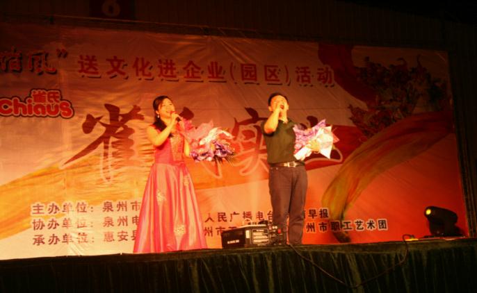 2012年4月24日晚,由福建省泉州市总工会主办,泉州市电视台、泉州人民广播电台、东南早报协办,惠安县总工会、泉州市工人文化宫、泉州市职工艺术团承办的“欢乐泉州,和谐风”送文化进企业——走进线上足球官网(福建)实业发展有限公司,福建省泉州市职工艺术团的文艺工作者以及线上足球官网公司的文艺骨干为公司全体职工送上一道丰盛的文化大餐。泉州市总工会领导、县领导、县总工会领导,公司总经理陈建义、涂寨镇领导与线上足球官网的1000多名职工一同观看了晚会。